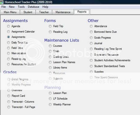 You can even input and print a scope and sequence, a supply list, or a borrowed items due list if you use the program to the fullest potential. It seems they have thought up every input column a homeschool mom might need and included it. I was truly impressed. [I used to be a database manager, so impressing me with software is not so easy.]